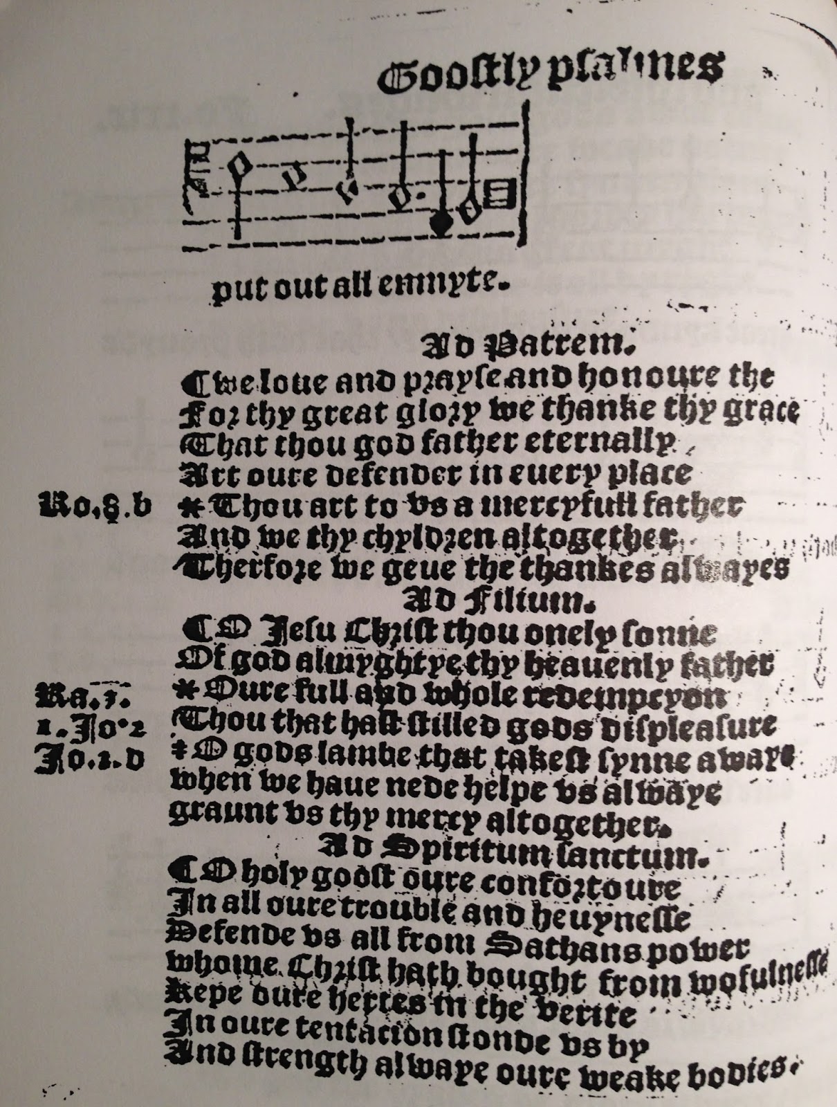 The tune’s first appearance in print (with some differences including the division of some note values as well as a different beginning to the B phrase), though, was in Goostly Psalmes and Spirituall Songes (London, 1535), with Coverdale’s translation: